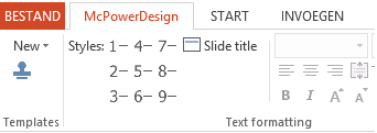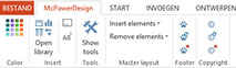 McPowerDesign voegt een extra tabblad aan uw PowerPoint omgeving toe. Met 1 klik uw huisstijl in uw PowerPoint presentatie.